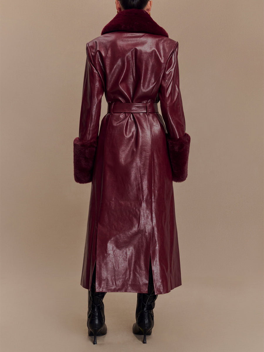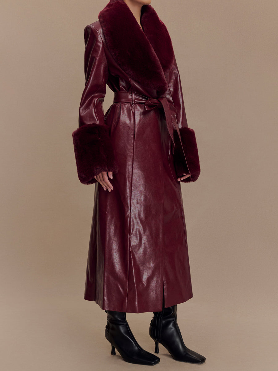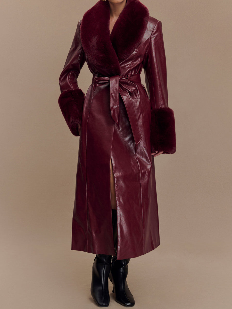Fashion Faux Leather Trench Coat With Faux Fur